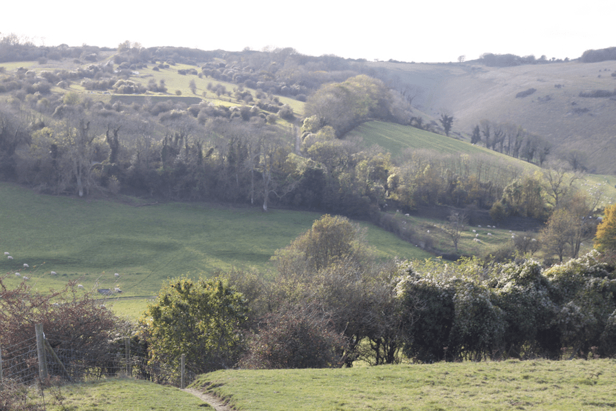 The sun is still shining and I take off through the farm buildings, along a path that runs eastwards, past three tied cottages and up onto the South Downs Way.