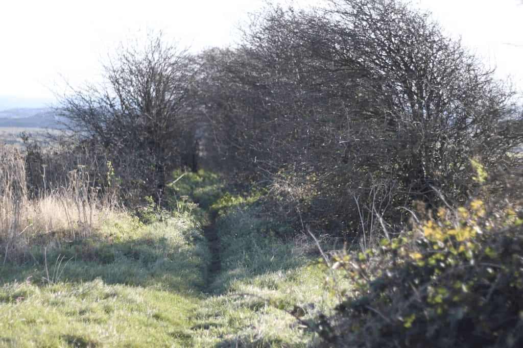 The cows have all gone now, so I get up and walk back towards Saddlescombe, across one field then another, and through a gate that leads to a small path enclosed by a hedge on one side and a bank on the other.